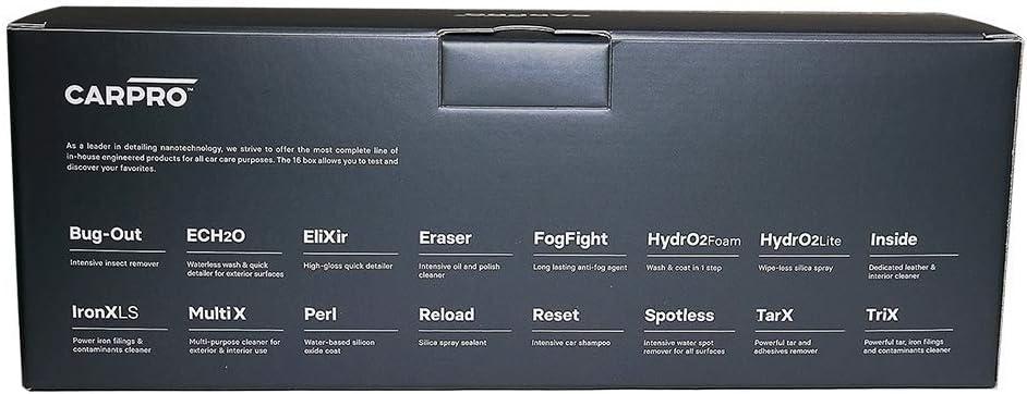 KIT INCLUDES: CARPRO 50ml (2oz) bottles of the following- Bug-Out, ECH2O, EliXir, FogFight, HydrO2 Foam, HydrO2 Lite, Inside, IronX LS, Multi X, PERL, Reload, Reset, Spotless.