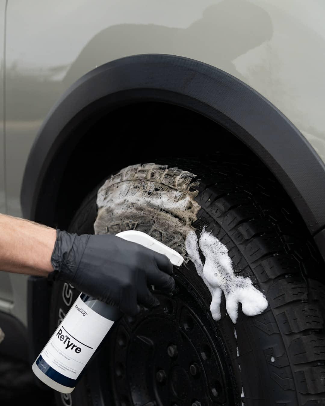 ReTyre from CARPRO provides a sparkling clean new tire look and prepares the surface to apply BlackOut, Perl or your favorite tire sealant.
