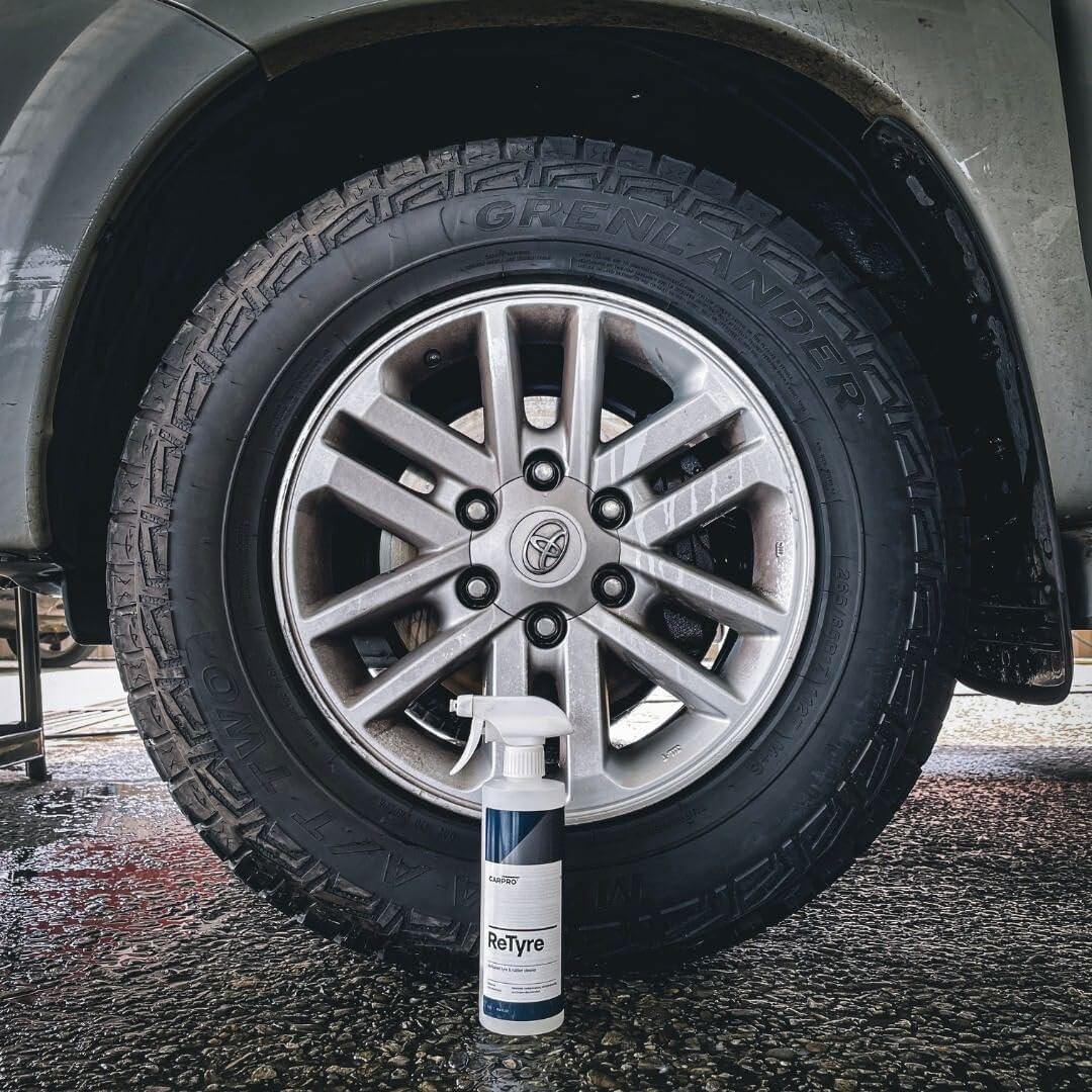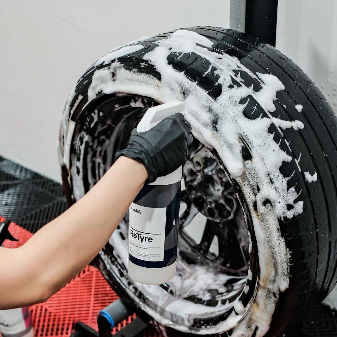CARPRO ReTyre was designed from the ground up specifically for the easy cleansing of tires from accumulated tire dressings, road film, and browning antioxidants.